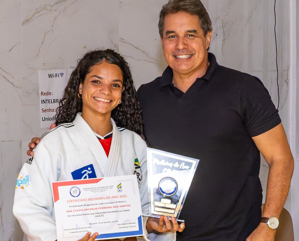 Na oportunidade, o vice-presidente Ricardo Moura realizou a entrega do Prêmio Melhores do Ano FAJU à atleta Ana Santos, destaque na categoria Cadete, reconhecendo seu desempenho, dedicação e resultados alcançados ao longo da temporada.